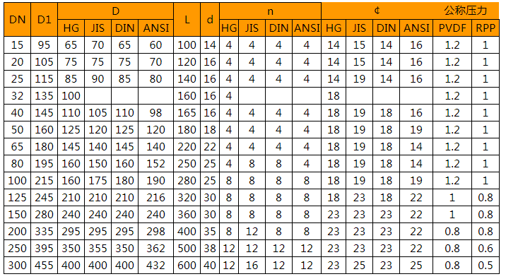 Q41F-10S法蘭塑料球閥外形對照表: