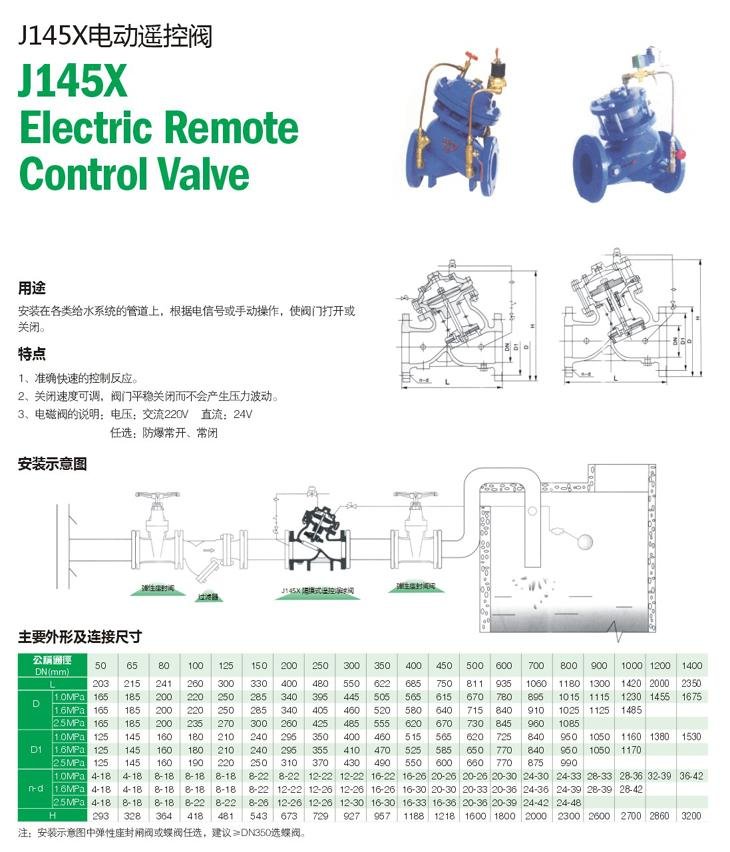 J145X隔膜式電動遙控閥是安裝在各類給水系統(tǒng)的管道上,根據電信號或手動操作,使閥門打開或關閉。準確快速的控制反應。關閉速度可調,閥門平穩(wěn)關閉而不會產生壓力波動。采用三向電磁閥,維護簡單。