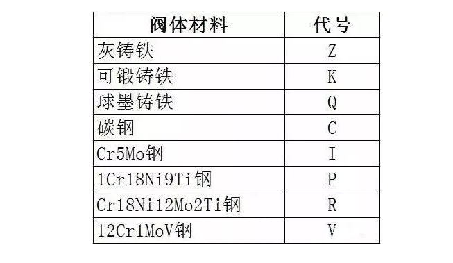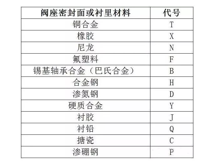 第五單元為閥座密封面或者襯里材料代號,用漢語拼音字母表示
