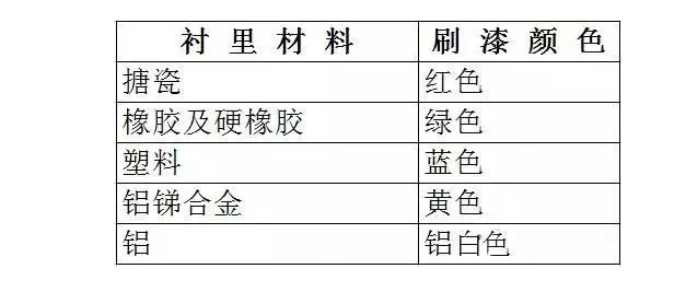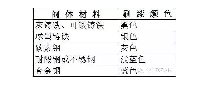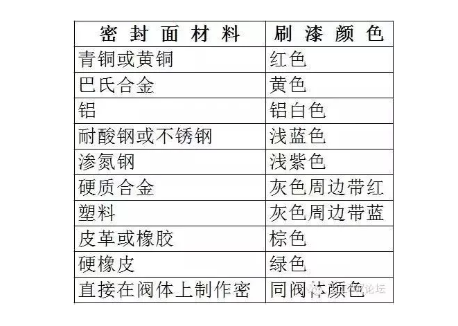 但耐酸鋼或不銹鋼閥體,也可以不涂漆。有色金屬閥體,不必涂漆。表示密封面材料的油漆,刷在手輪、手柄或自動閥件的蓋上,其顏色與密封面材料的關系如下: